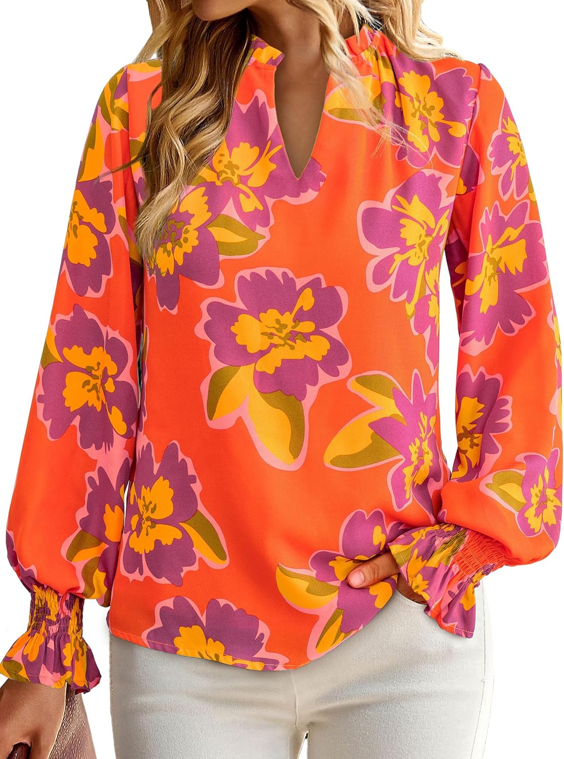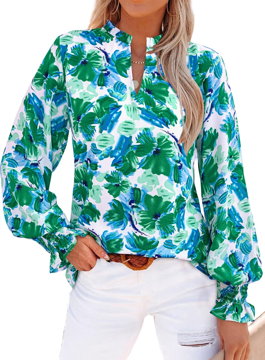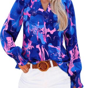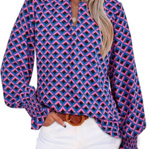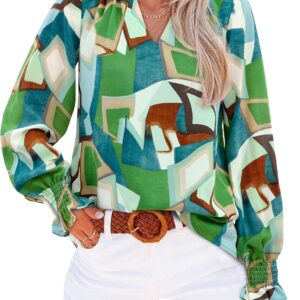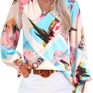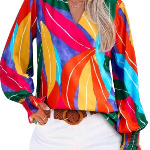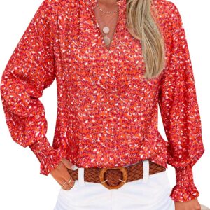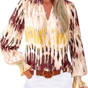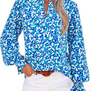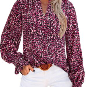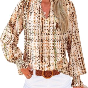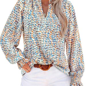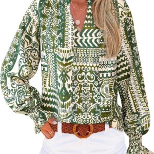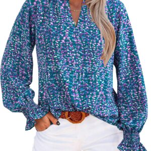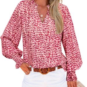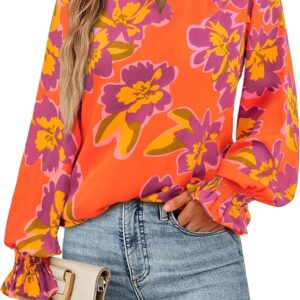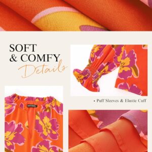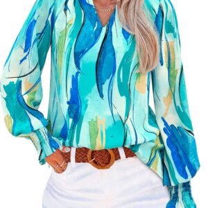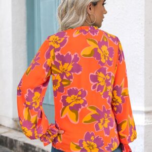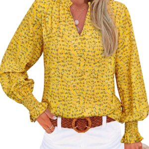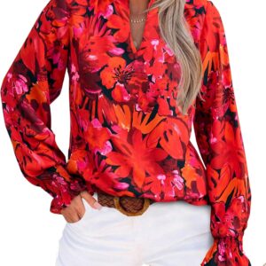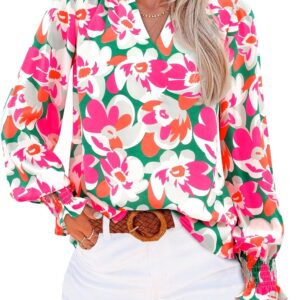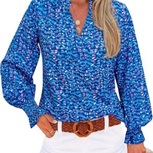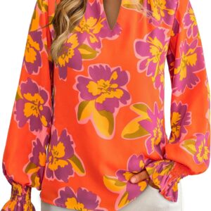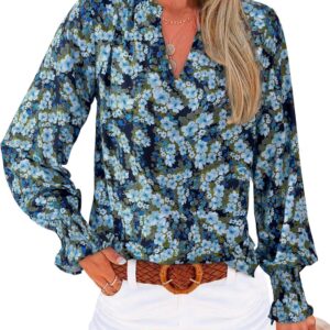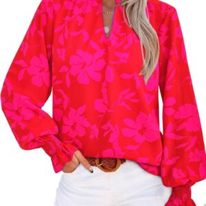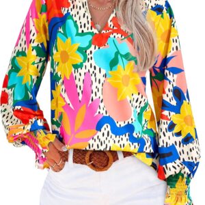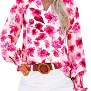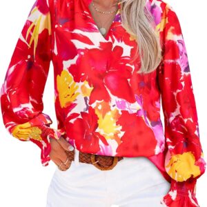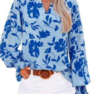 MASCOMODA Womens V Neck Floral Long Sleeve Tops 2025 Summer Casual Loose Puff Sleeve Chiffon Boho Work Blouse Dressy T Shirts