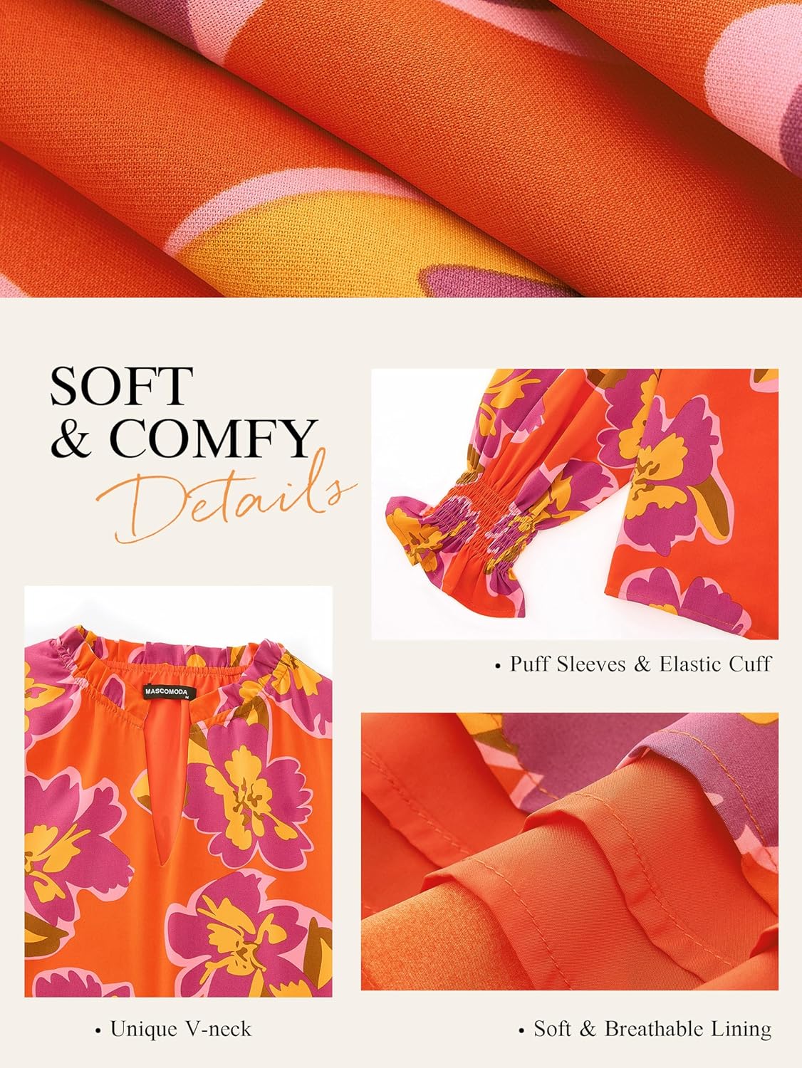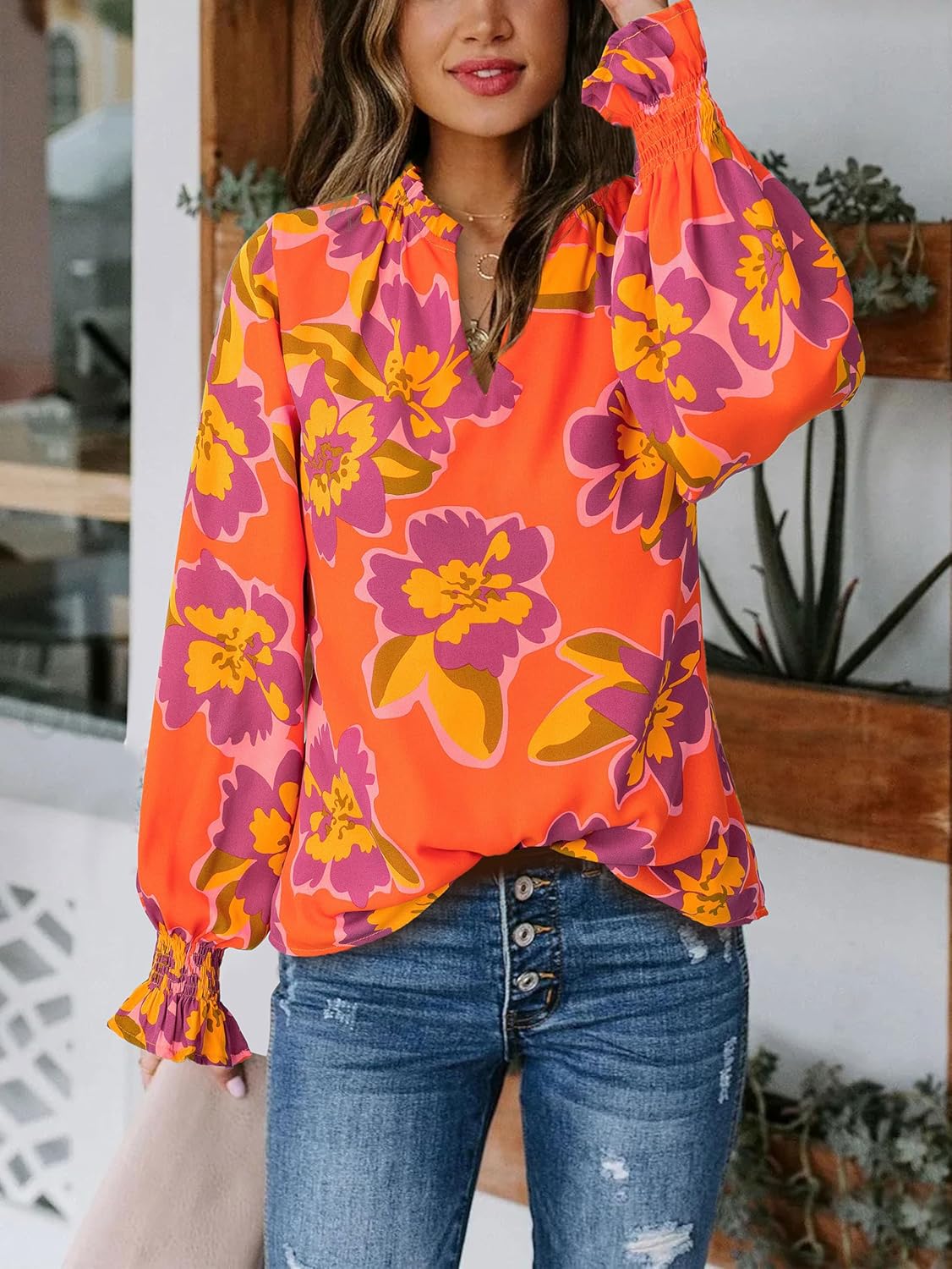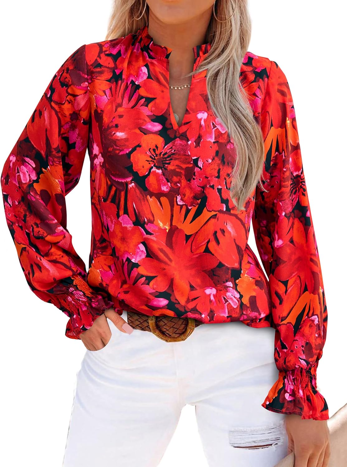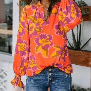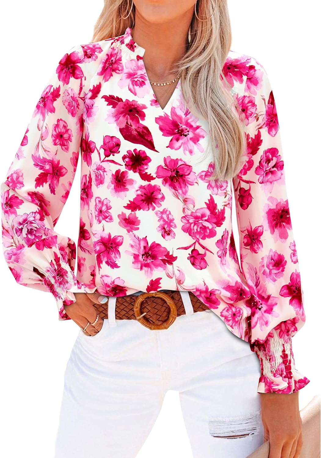 MASCOMODA Womens V Neck Floral Long Sleeve Tops 2025 Summer Casual Loose Puff Sleeve Chiffon Boho Work Blouse Dressy T Shirts