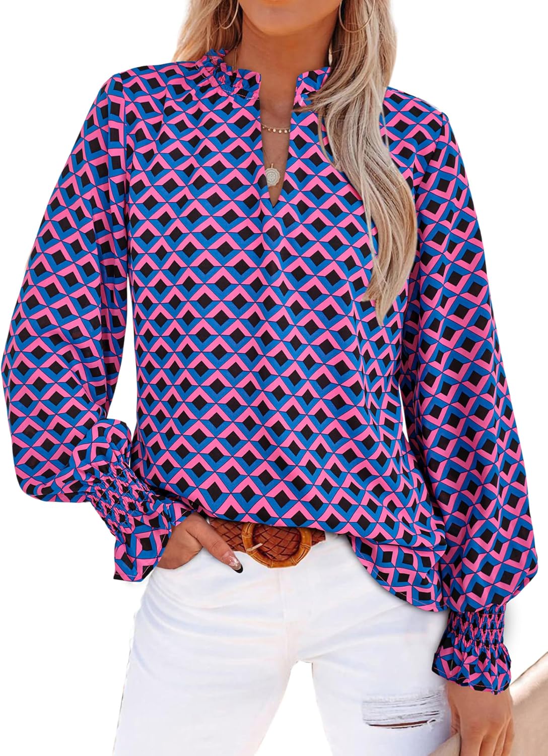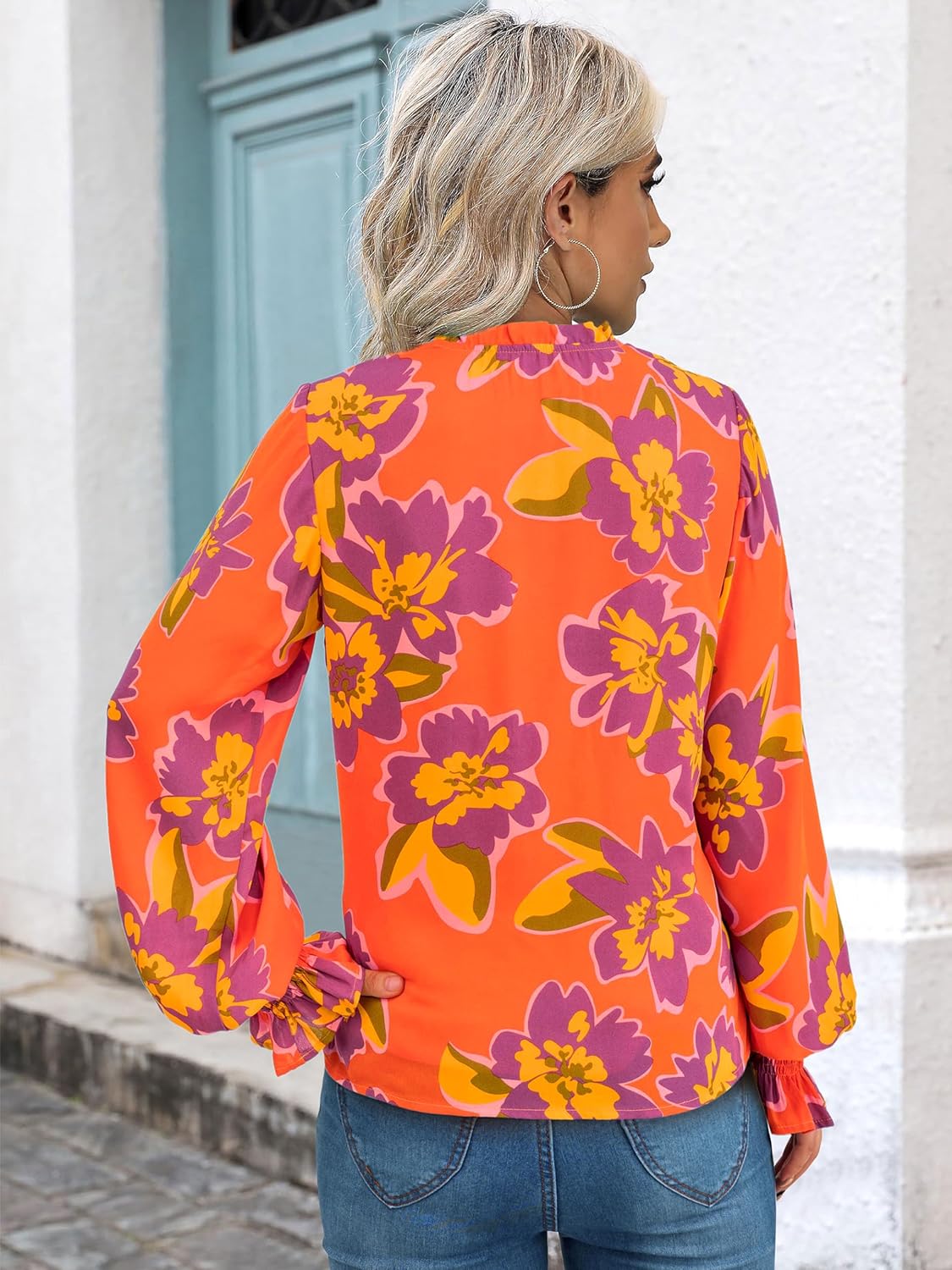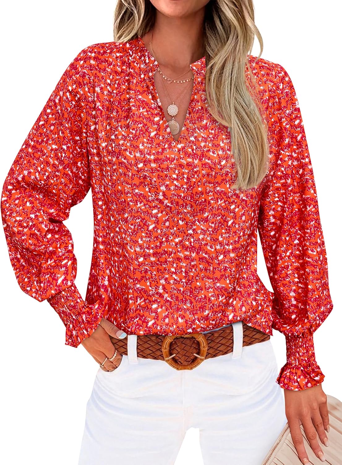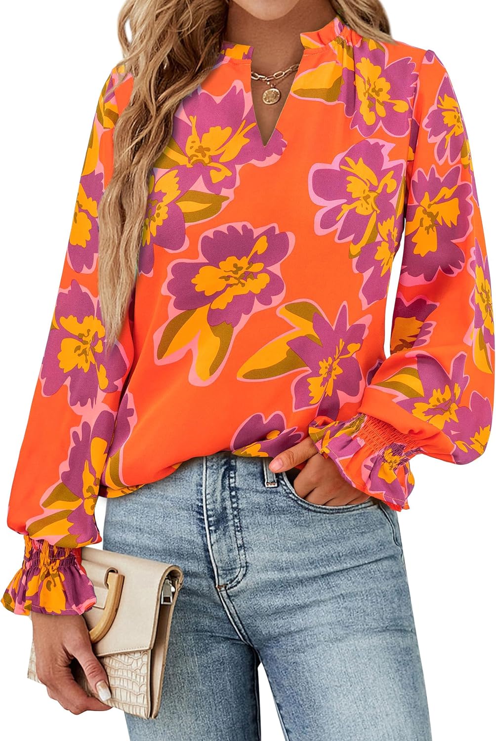MASCOMODA Womens V Neck Floral Long Sleeve Tops 2025 Summer Casual Loose Puff Sleeve Chiffon Boho Work Blouse Dressy T Shirts