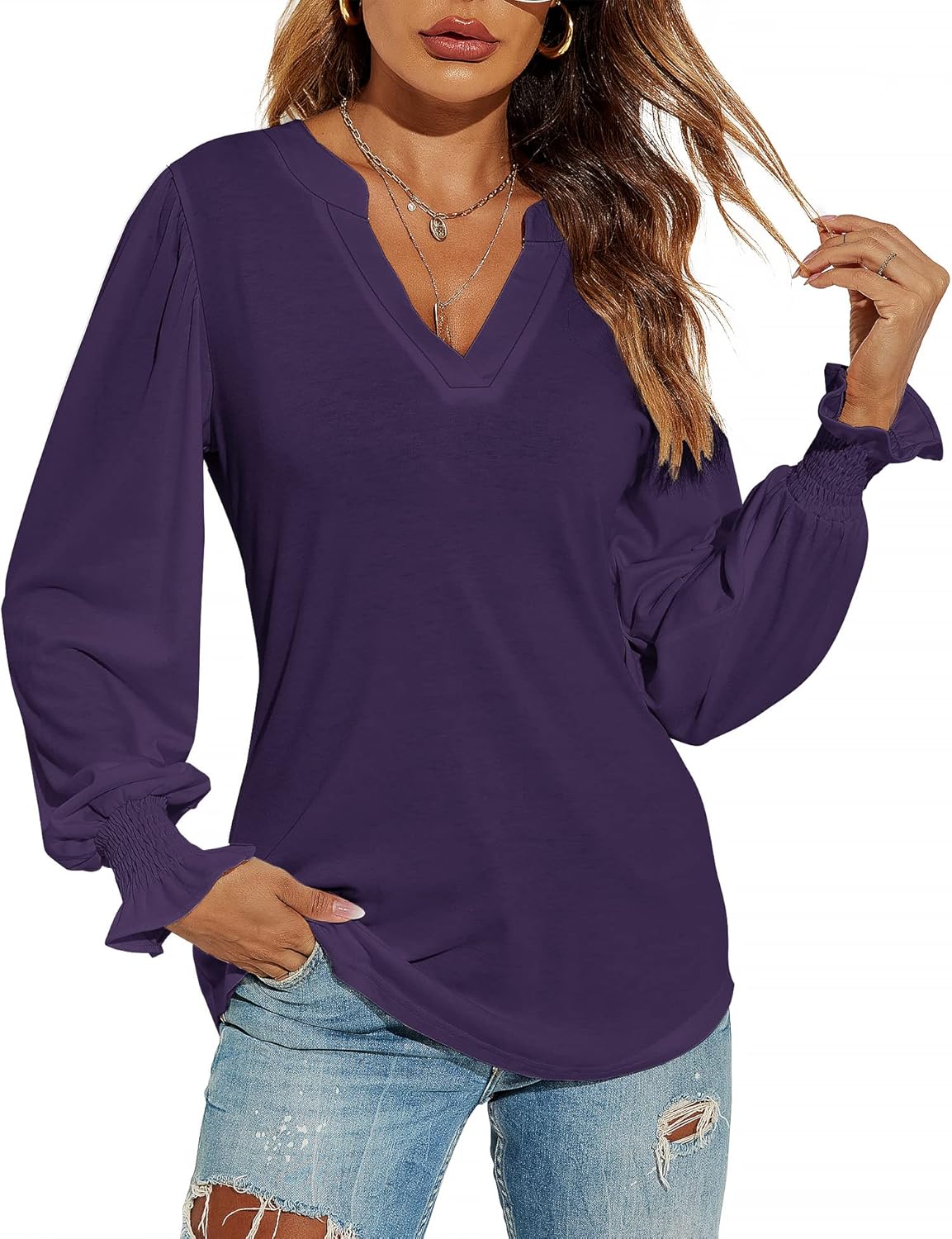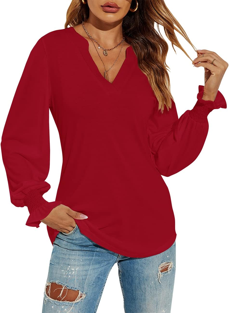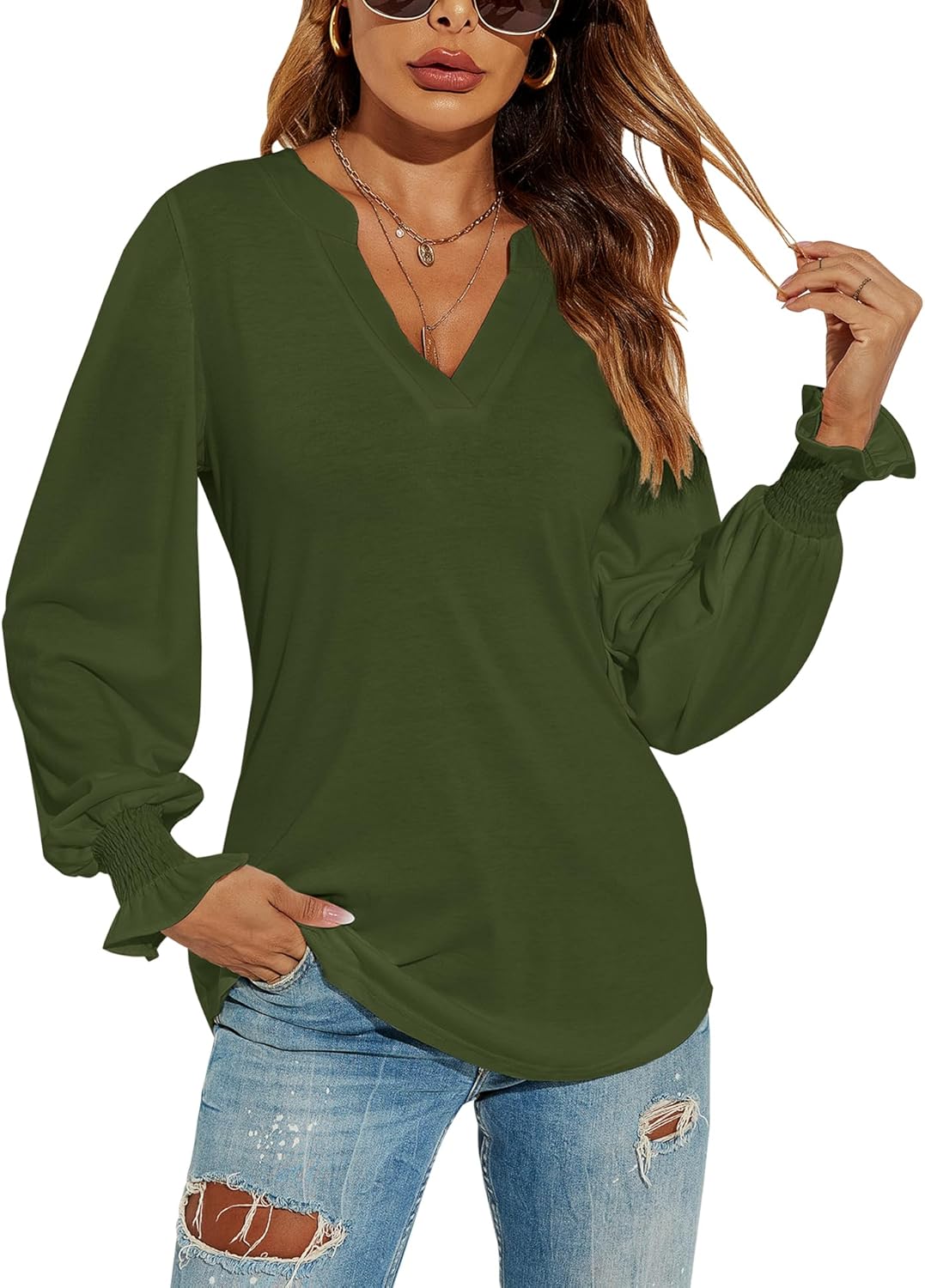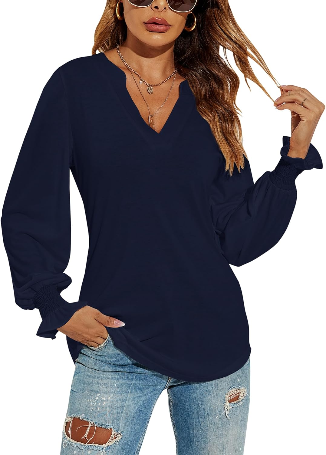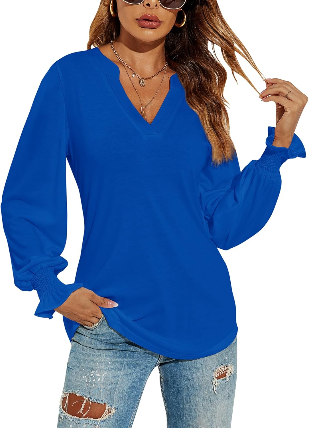 Romanstii Women's Casual V-Neck T-Shirts Loose Puff Long Sleeve Tops Tunic Blouses