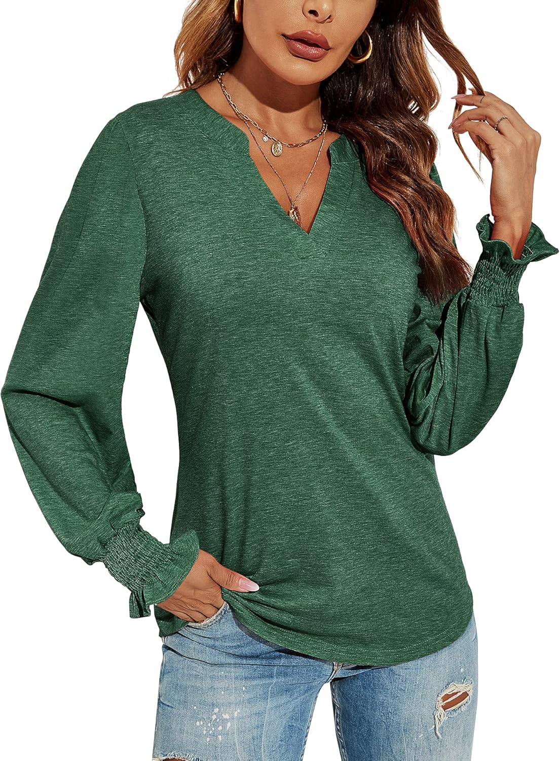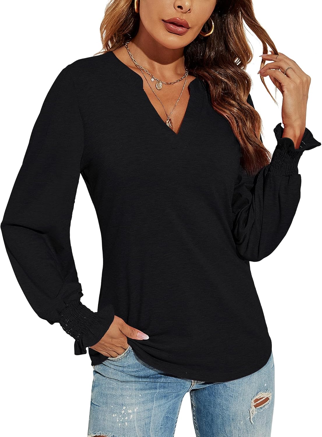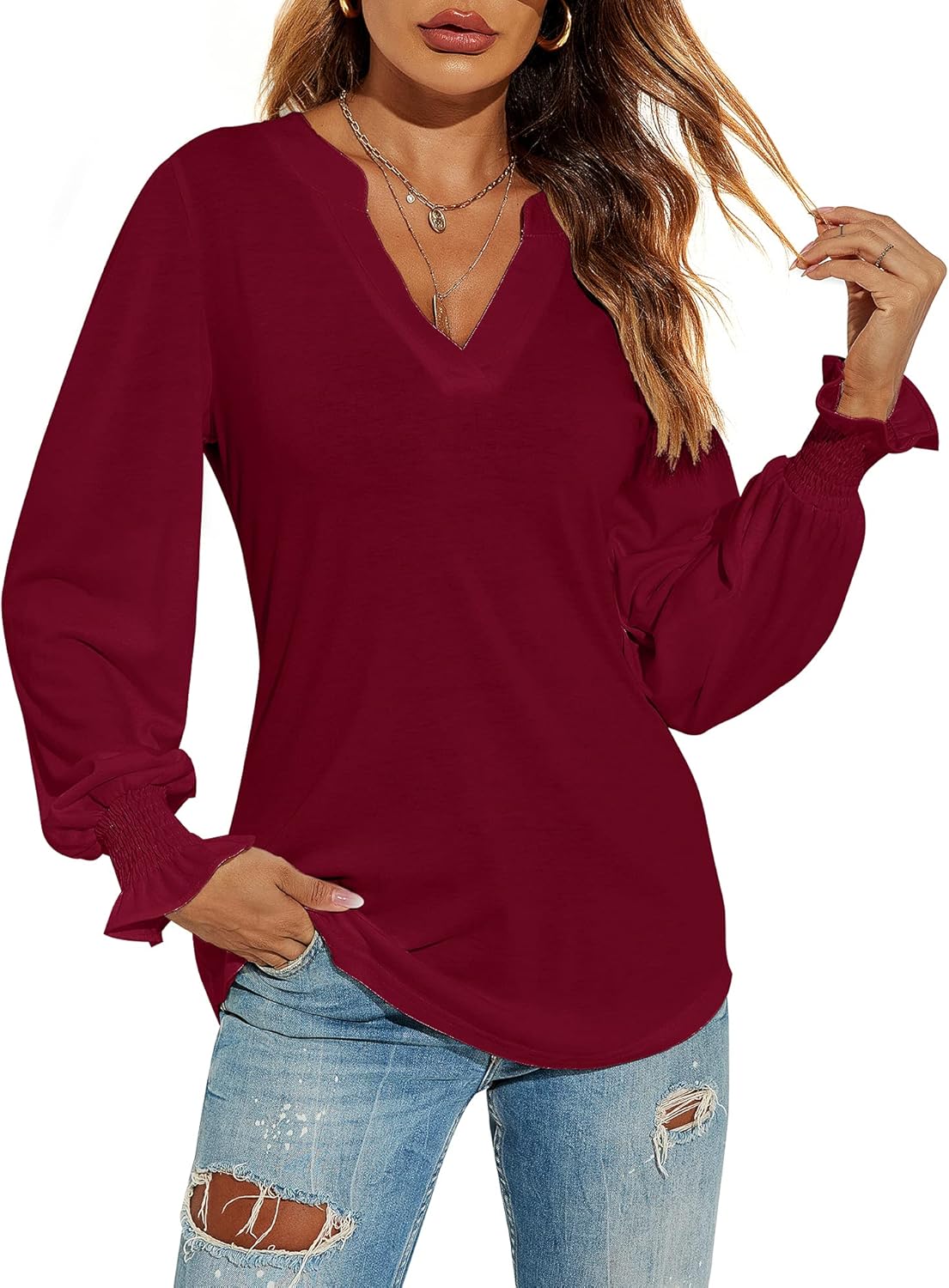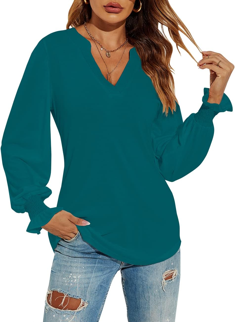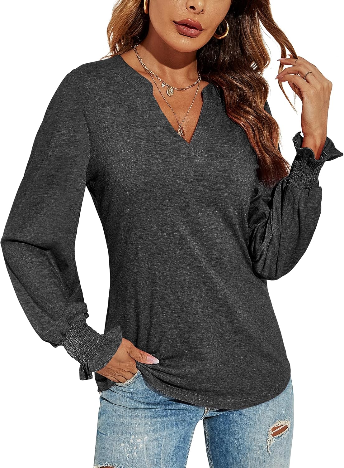Romanstii Women's Casual V-Neck T-Shirts Loose Puff Long Sleeve Tops Tunic Blouses