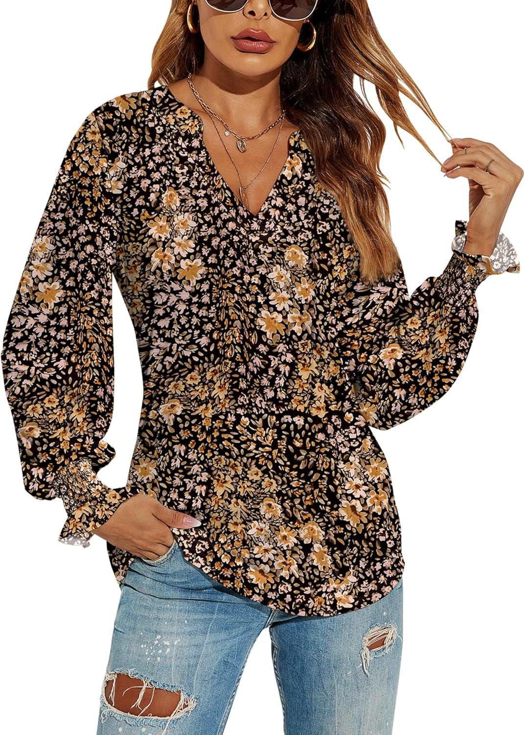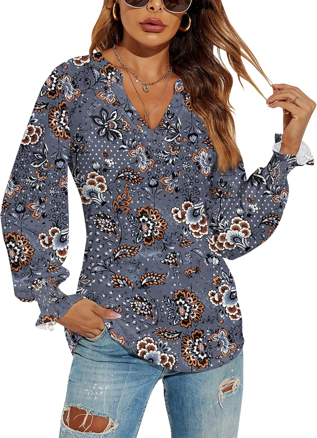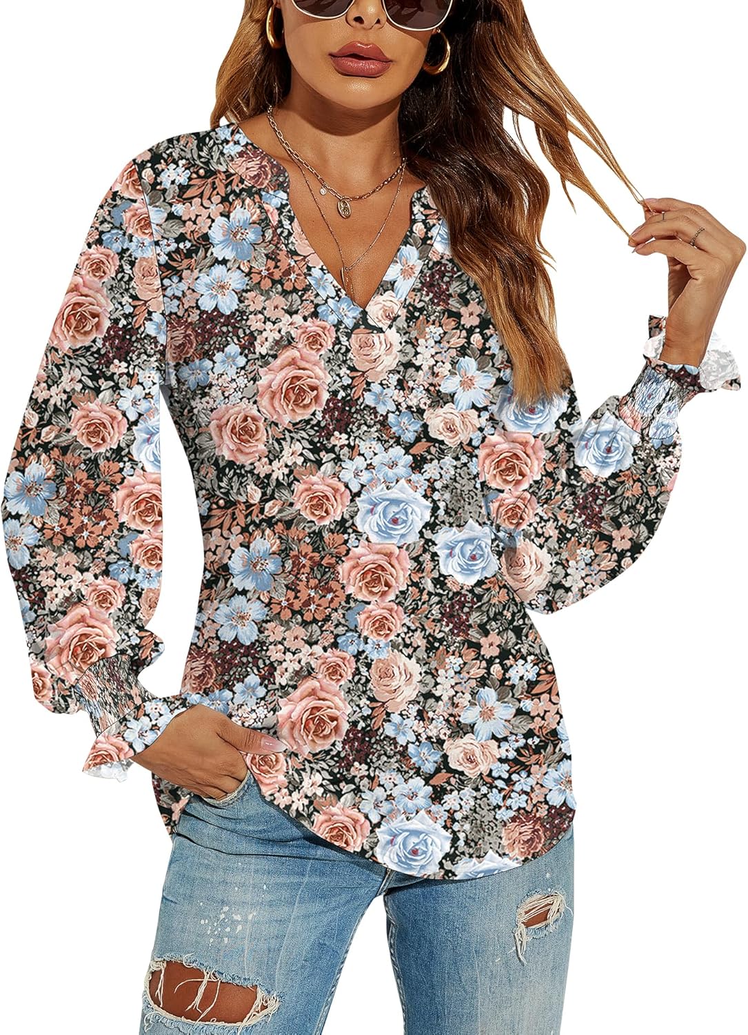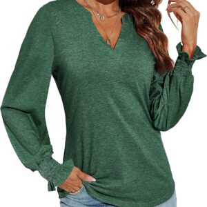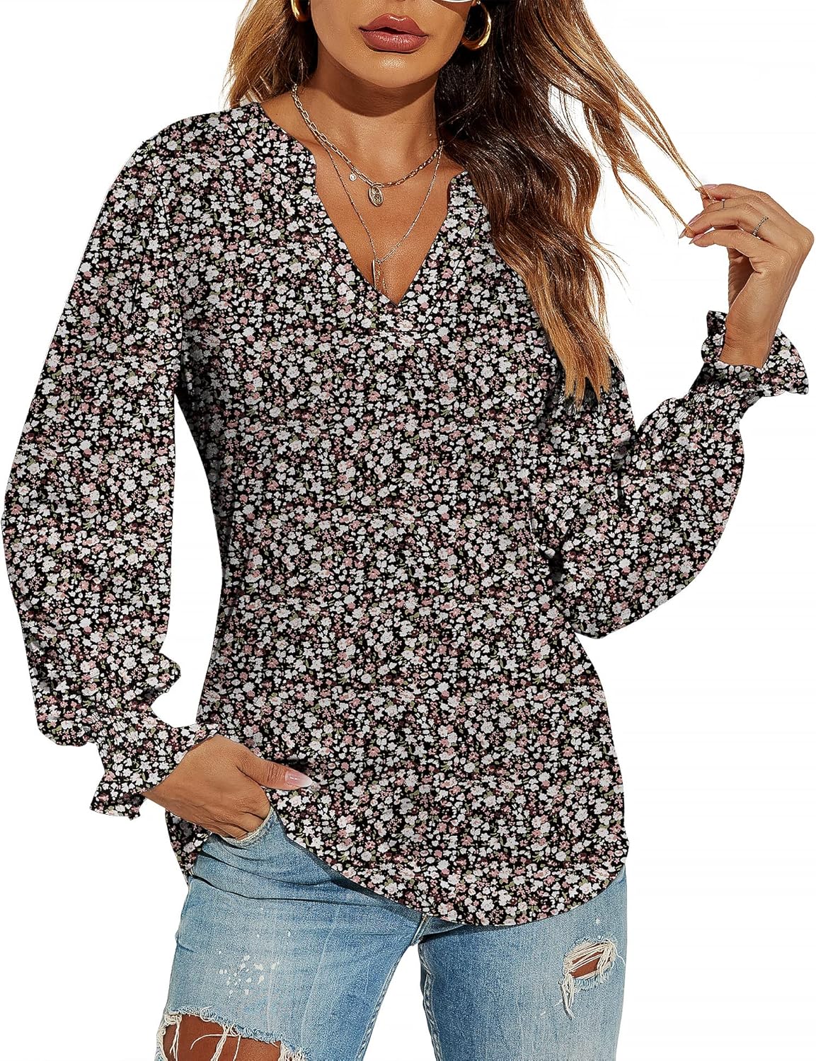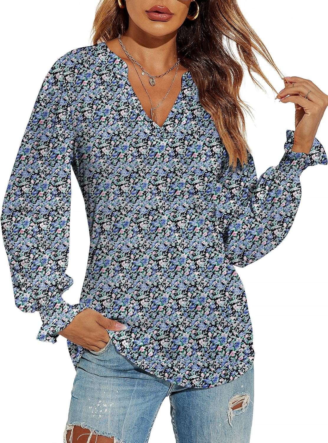 Romanstii Women's Casual V-Neck T-Shirts Loose Puff Long Sleeve Tops Tunic Blouses