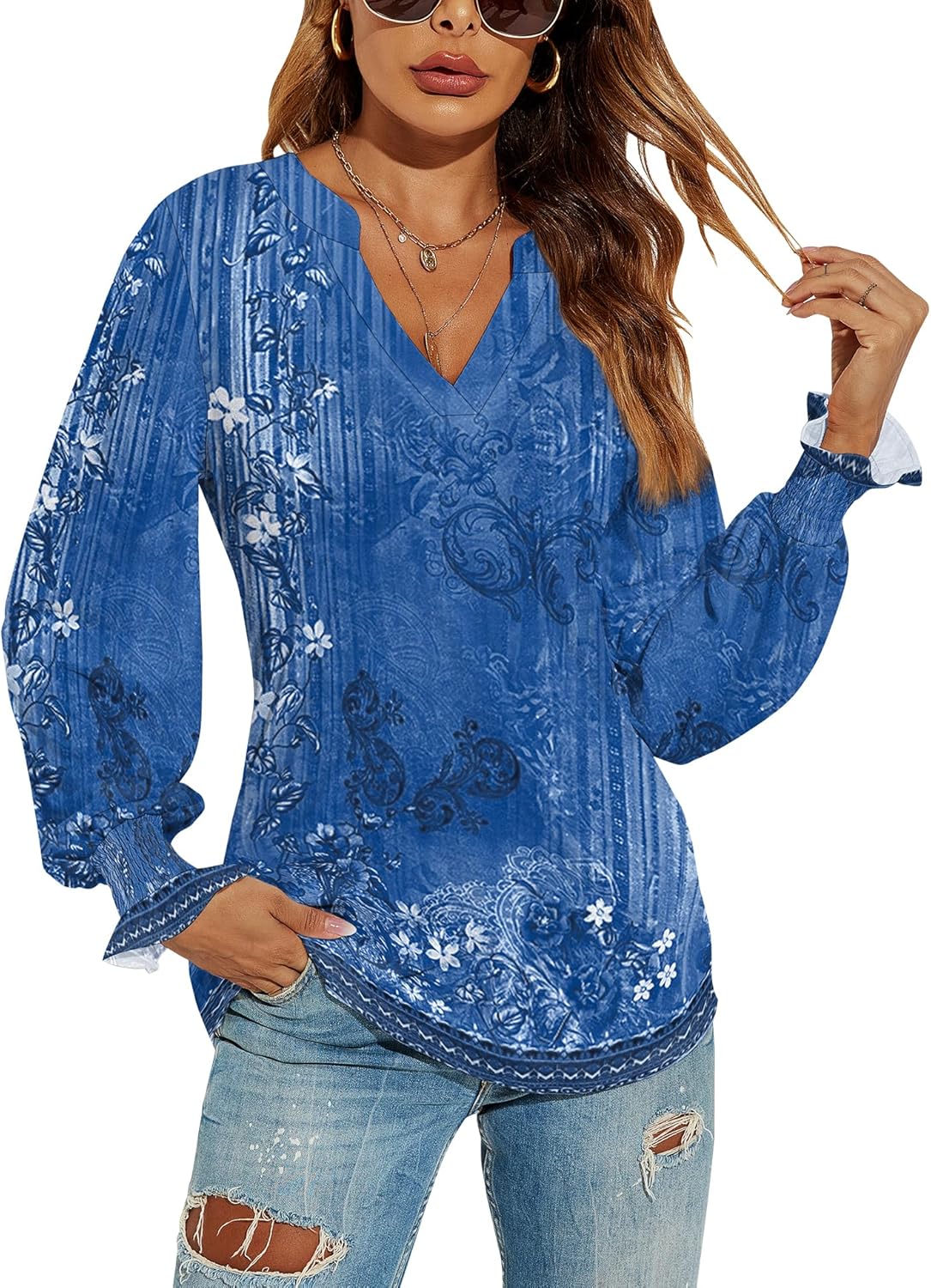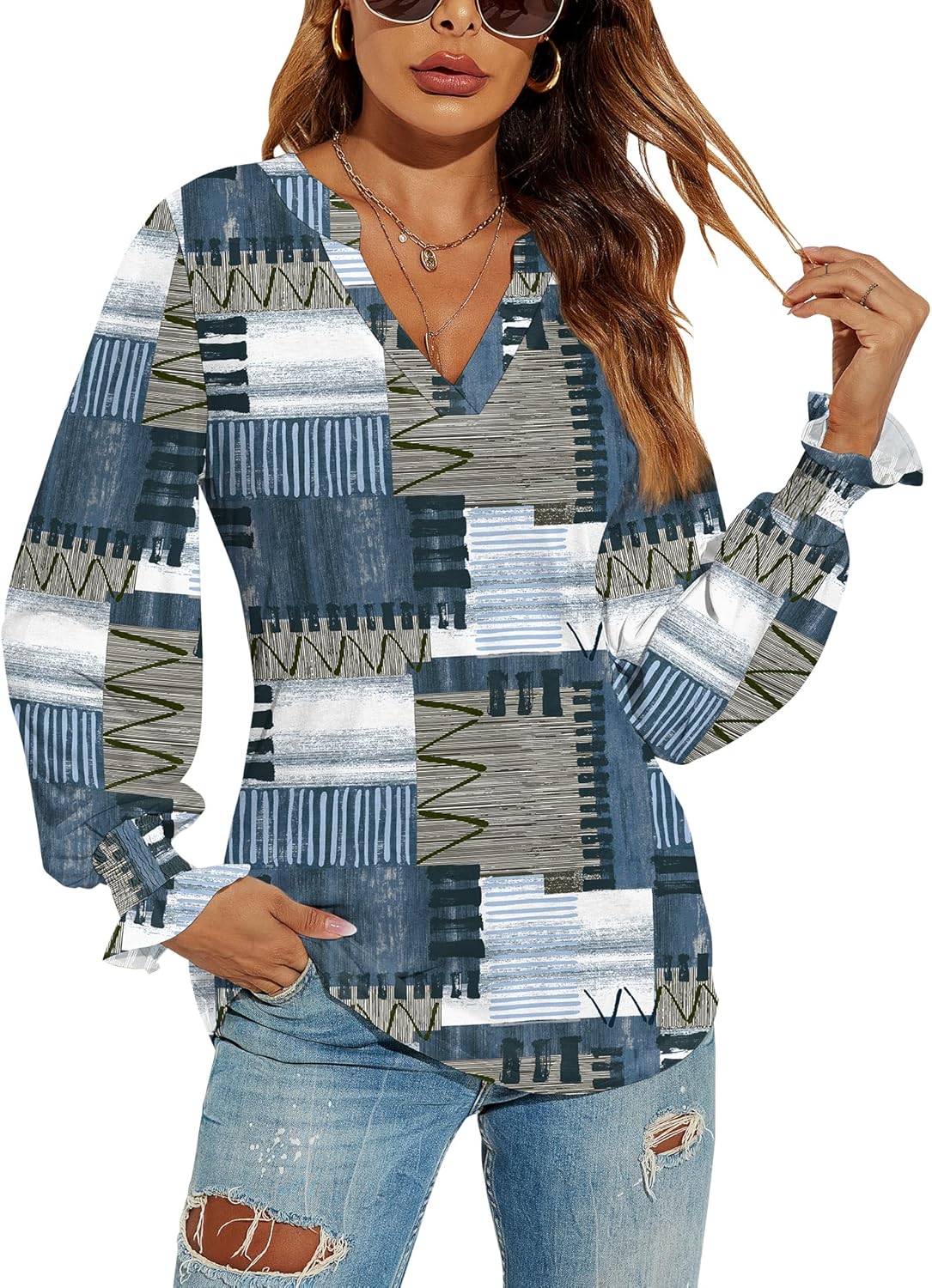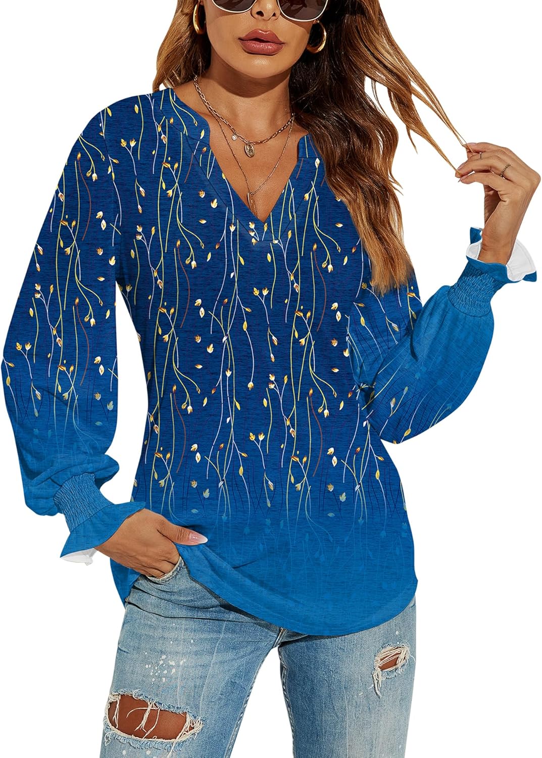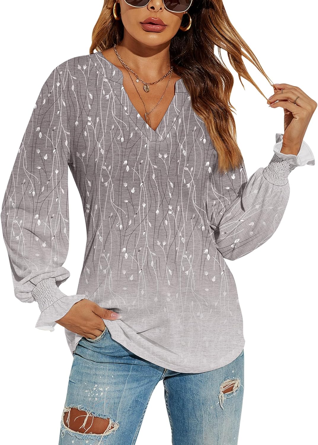 Romanstii Women’s Casual V-Neck T-Shirts Loose Puff Long Sleeve Tops Tunic Blouses