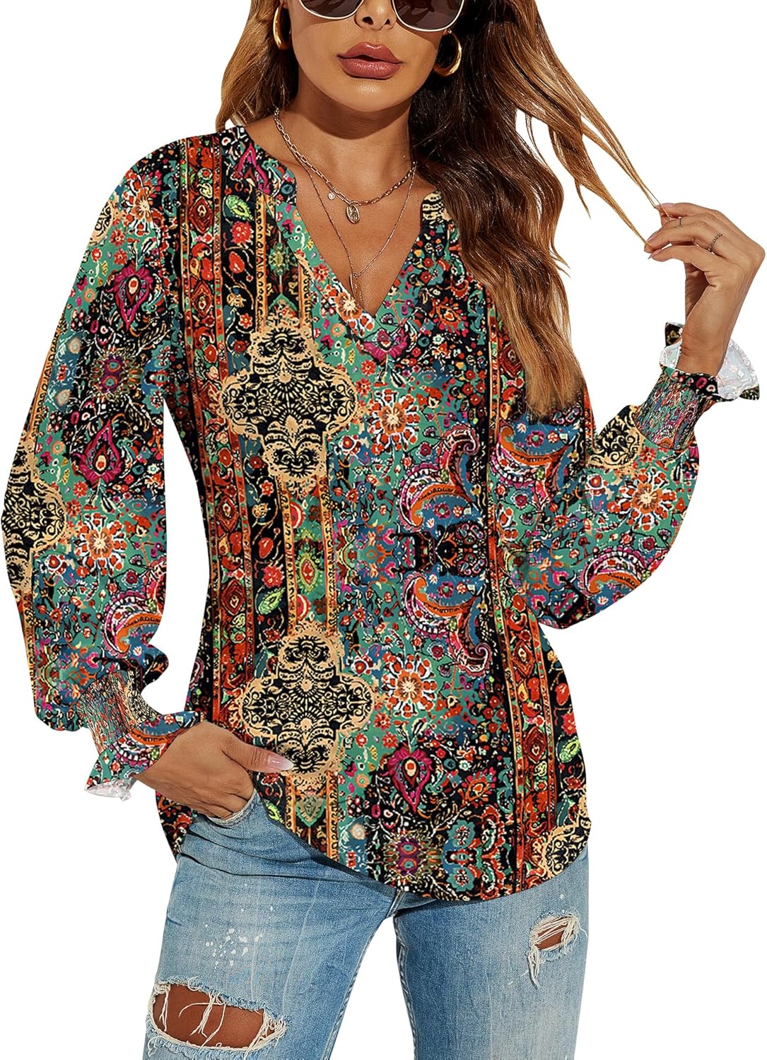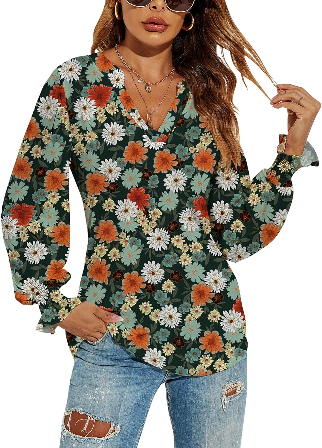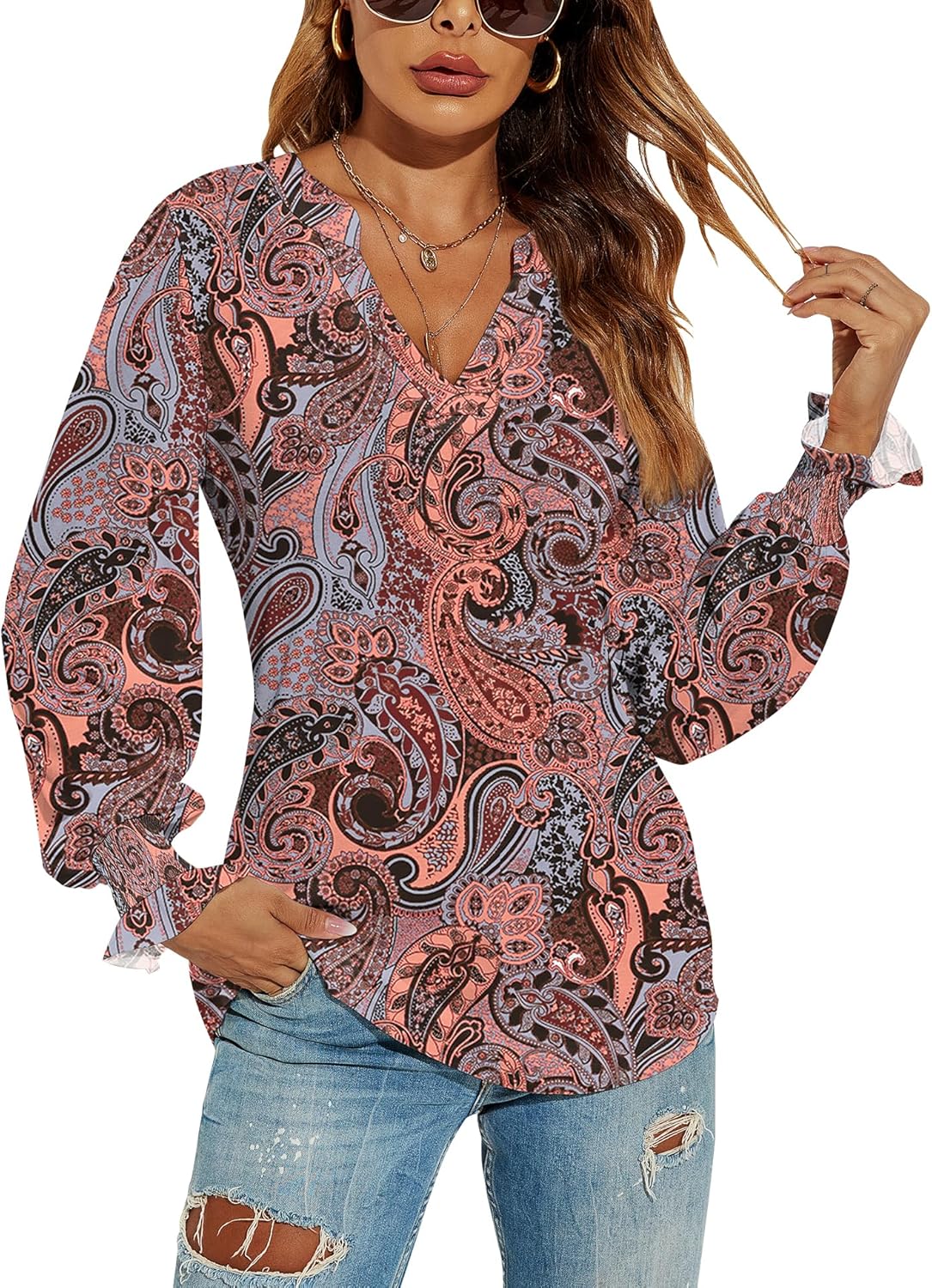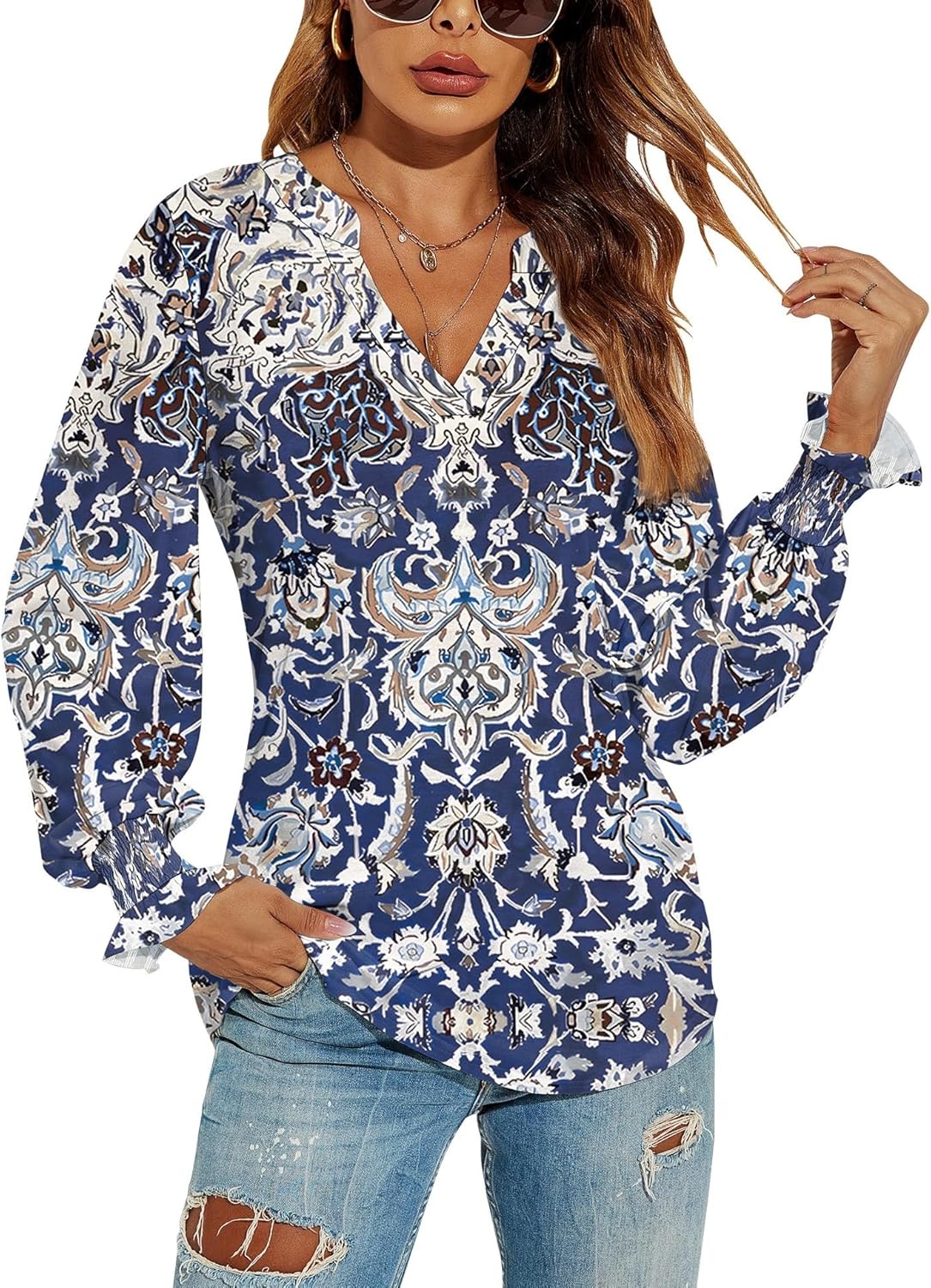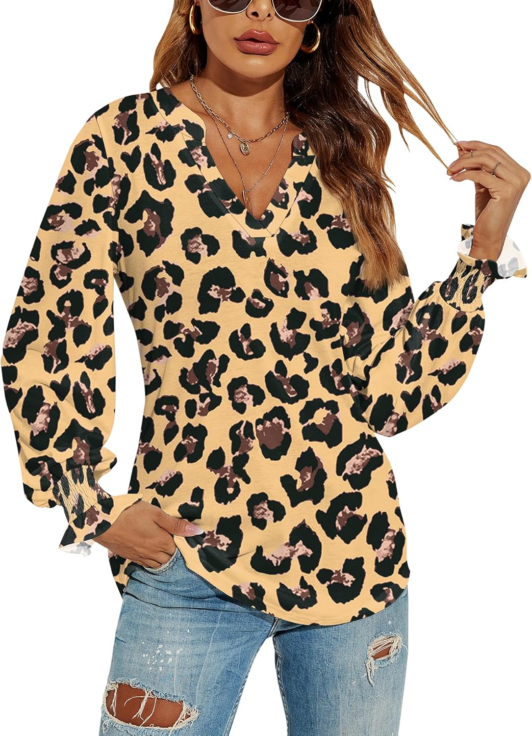 Romanstii Women’s Casual V-Neck T-Shirts Loose Puff Long Sleeve Tops Tunic Blouses